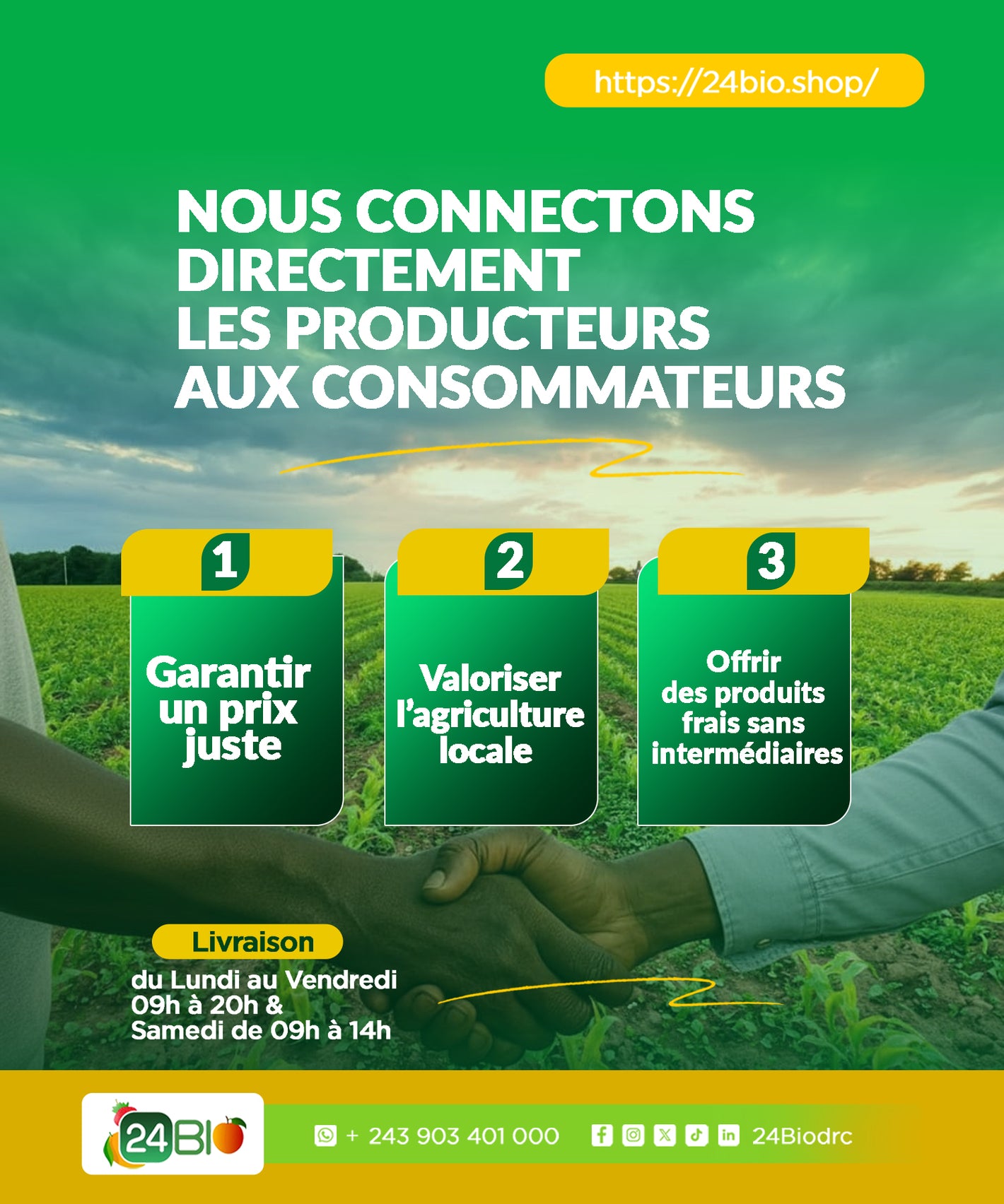 Chez 24Bio, nous avons conscience que l'industrie agroalimentaire est en constante évolution chaque jour et que les tendances actuelles sont axées sur le manger sain et équilibré. C'est pourquoi, nous proposons des produits en accord avec les valeurs de nos clients, notamment des fruits et légumes de saison. Nous essayons au maximum de nous fournir en fruits et légumes frais chez des producteurs congolais afin de réduire notre impact environnemental et faire travailler des artisans locaux.